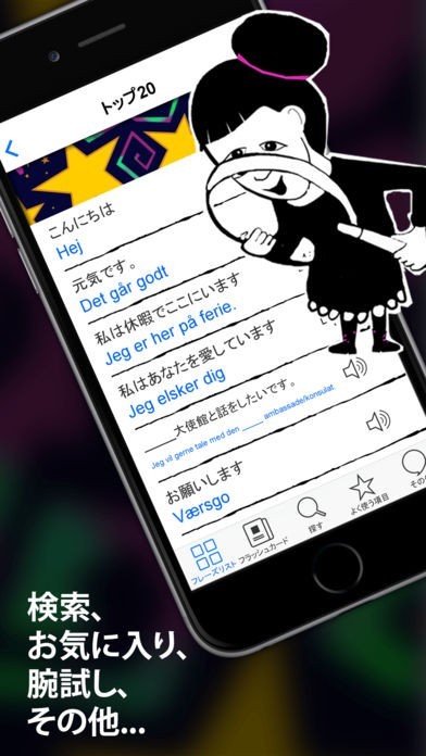 Phrasiにはお気に入り機能も付いているため、よく使うフレーズや単語を簡単に見つけられ、スロー再生でフレーズをしっかりと身につくまで何度でもゆっくり、はっきりと聞くことができます。海外で必要な言葉がすべて収録されているため、もう従来の訳文の本を持ち歩く必要がないので、鞄が軽くなります。