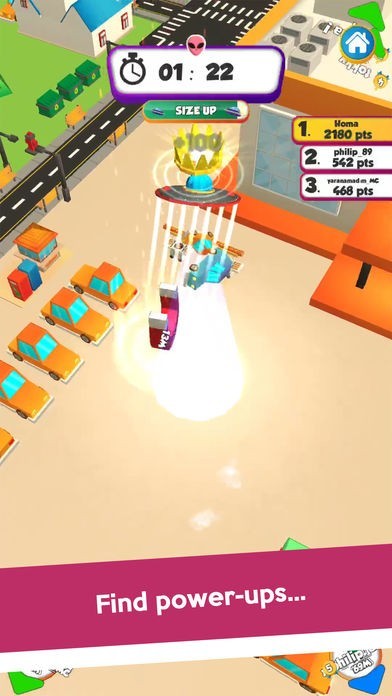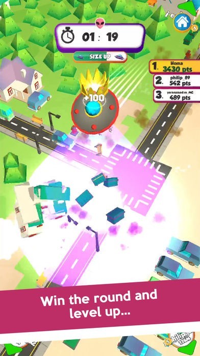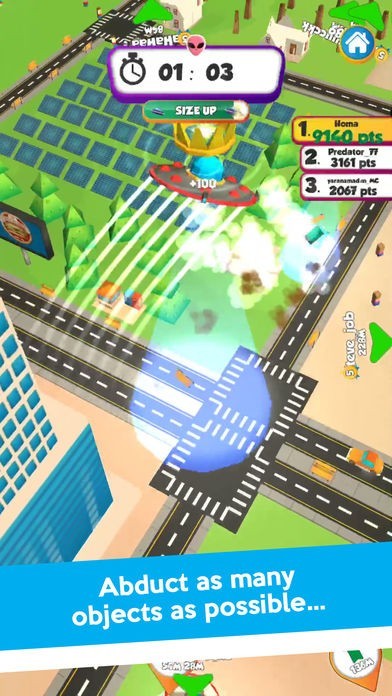 「UFO.io:マルチプレイヤーゲーム」は、UFOを操作して街にある様々な物をを飲み込むアクションゲームです。オブジェクトやパワーアップアイテムを吸い上げるとUFOを成長させることが出来ます。どのUFOよりも大きくすることが出来れば王様になれる楽しいゲームとなっています。