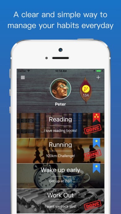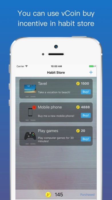 【Developing good habits by self-motivation】 you can set incentives and things you wanna buy* at Habit Store, such as go for travel or buy yourself a new shirt, and buy these incentives through vCoin acquired by recording the habit. This incentives are helpful for you to develop your good habits. Also you can set "Habit linked incentive", this kind of incentives require you not only vCoin, but also a certain record count for a habit. For example, you can set the incentive to buy a new running shoes when your have run for 200 km.