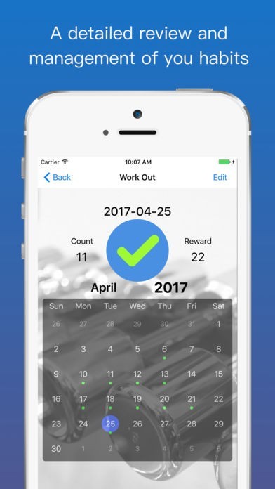 【Detailed Habit Interface】 By visualization tools such as calendar, statistical data, charts, you can well manage your daily records of habits. You can also record notes and photos per day per habit and look the chart spans form day to year to visualize your habits. In addition, you can share your habit record to social medial.