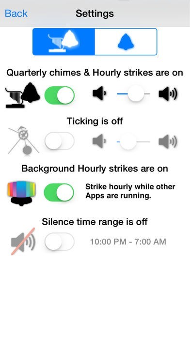 Slide your finger or tap a button to turn On / Off and set the volume level of the quarterly chimes, hourly strikes, and the ticking.