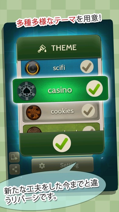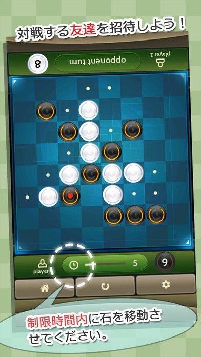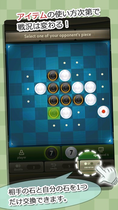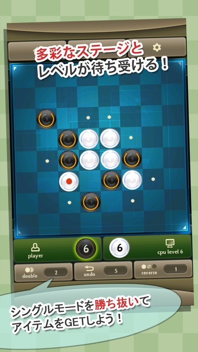 制限時間を使って、お友達を挟んで対戦プレイを楽しんだり、与えられた状況の下にリバーシゲームを楽しむことができます。1人で対戦するシングルモードでは、勝ったアイテムをゲットして行くことができ、様々な遊び方で楽しめるゲームアプリです。
