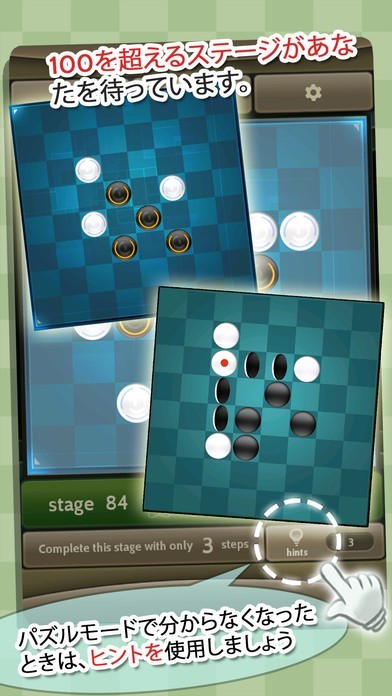 1人でリバーシゲームをでき、100問を超える多彩なステージやレベルに挑戦可能