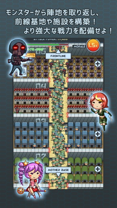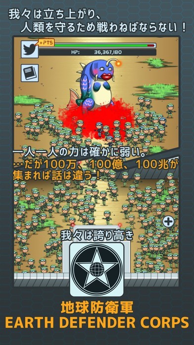 「一兆人で殴り続けると死ぬ【地球防衛軍】は地球に現れた巨大モンスターを倒すために何億人もの仲間たちと一緒に戦うゲームアプリです。モンスターを倒すことで地球の陣地を奪還することが出来るので新しい仲間たちを集めることが出来るようになっているだけでなく、特殊な施設を建造してより強力な仲間たちを作り上げることが出来るようになっています。仲間たちが出撃するマザーベースには秘密兵器が隠されているので、バトルでの大きな助けになってくれます。ユーザーが防衛軍の司令官として一緒に戦うことで仲間たちの士気を向上させてパワーアップさせることも可能になっています。