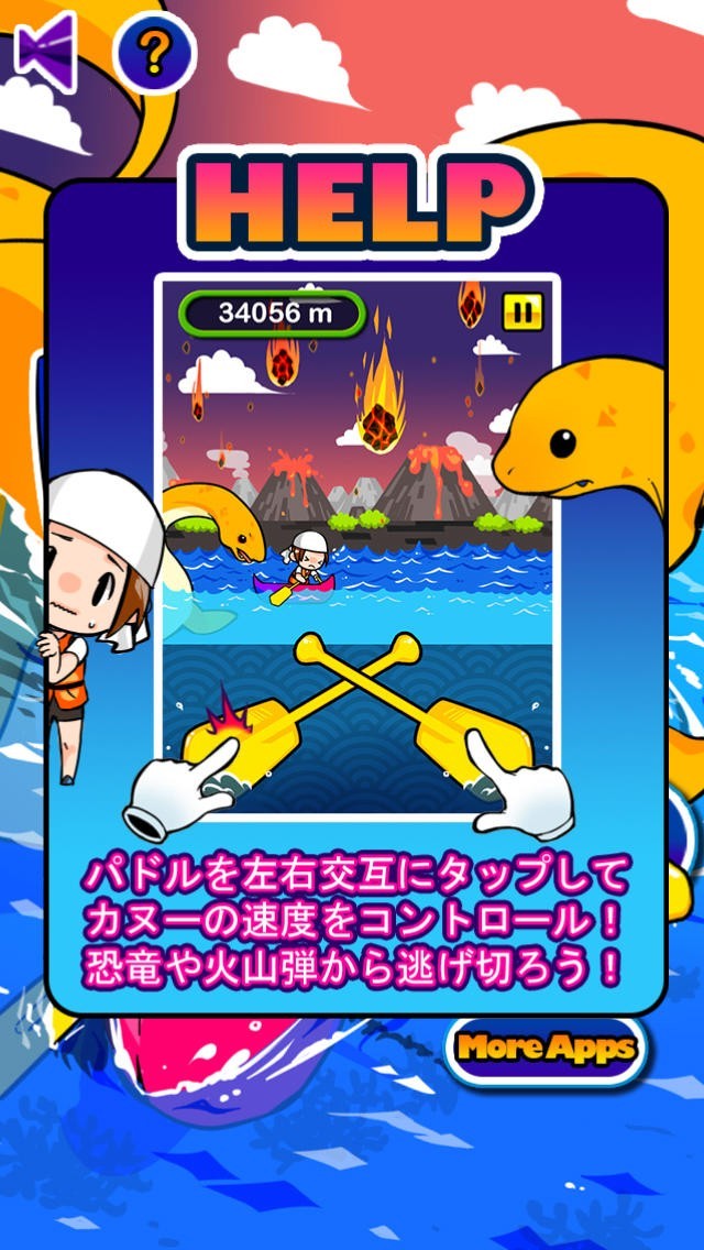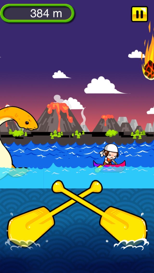 カヌーに乗って川を進んで行くアプリゲームです。カヌーの速度は、画面の左右にあるパドルをタップする速さで調節します。カヌーを漕ぐ背後からは、恐竜が追いかけてくるので、捕まらないように逃げなくてはいけません。が、早くカヌーを漕ぎ過ぎると、空から降ってくる火山弾に当たってしまいます。火山弾の落ちてくるリズムが変わるので先が読めず、パドル操作で上手く速度を調節しながら進みます。川を進んで行くに連れて水の流れや火山弾の落下スピードが速くなるので、油断大敵です。ハラハラドキドキ感を味わえるゲームです。