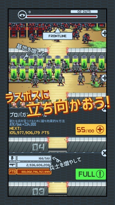 1人で戦うのではなく軍を率いて最終バトルを行います。プレイヤーが兵士を前線に送ると兵士がラスボスを攻撃しHPを削ります。ボスのHPが無くなればプレイヤーの勝利です。