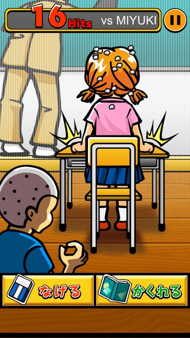 学校で様々なイタズラを考えたとしても、今のご時世なかなかリアルに実行できないものです。そんな少年、少女にオススメしたいのがこの「けしカスとばし」!アプリの中に出てくるクラスメイトにけしカスをとばし、嫌という程イタズラできます!「なげる」と「かくれる」という二つのボタンを駆使してイタズラするだけなので、操作もとても簡単です!コツは、クラスメイトが真面目に授業を受けているうちは、ひたすら早い連打でけしカスを投げ、クラスメイトが頭に手を動かした瞬間に「かくれる」ボタンを押す事です。この判断を早くする事でまずバレる事は無く、心ゆくまで消しカスを投げる事が出来ます!現実ではできないうっぷんを、アプリで発散させましょう!