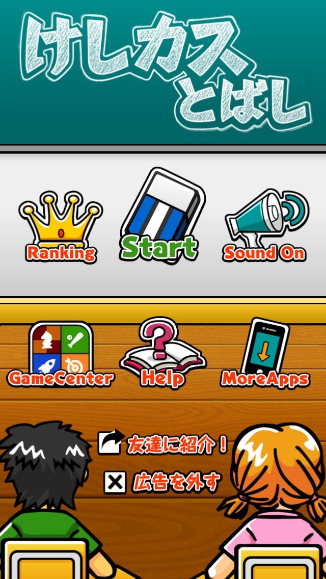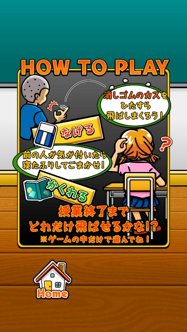 「けしカスとばし」はクラスメイトにばれない様にけしカスを飛ばす、イタズラアクションゲームです。 ゲームを始めると、授業が始まり、前の席には男子の「KENJI」か女子の「MIYUKI」がランダムで座っています。 プレイヤーは後ろに座る坊主頭の少年になり、前の席の子に気づかれない様にけしカスを飛ばしていきます。 「なげる」をタップするとけしカスを飛ばしていきます。途中前の席の子が髪に手を添えるとバレる可能性があるので、「かくれる」をタップして上手く隠れてください。 授業が終わるか、バレて席を立たれてしまうとゲームは終了です。 飛ばした個数がそのままスコアになるので、「なげる」連打と「かくれる」の上手な切り替えがポイントになります。