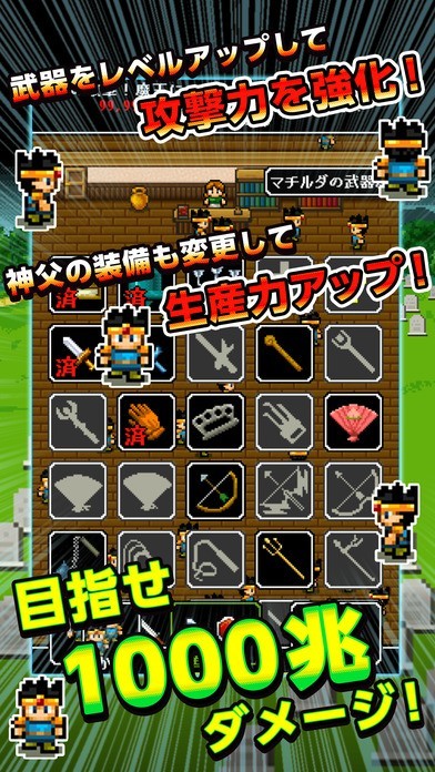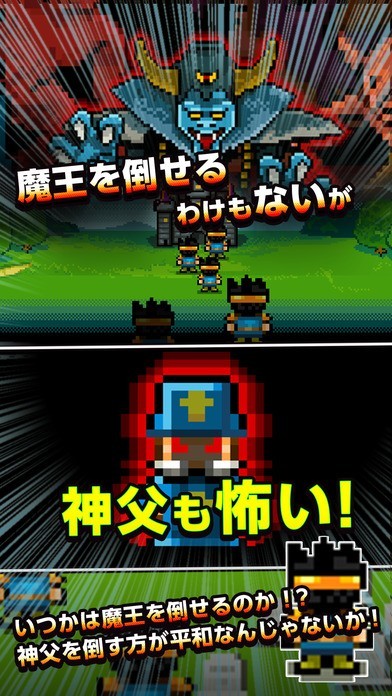 画面をひたすらタップすることで魔王を倒すことができるゲームアプリが「【悲報】人類みんな勇者計画~雑魚勇者がだくだく復活~」です。魔王によって支配されてしまった世界を救うために怖い神父が立ち上がり、倒される勇者をひたすら復活させることで魔王打倒を目指すゲームとなっていて、プレイヤーはひたすらタップを繰り返すことで勇者を生き返らせることができます。勇者をいけにえにしてジョブを手に入れたり、勇者を売って得たお金で装備を整えることもできます。