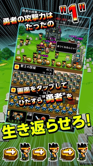 画面をひたすらタップして勇者を生き返らせて魔王打倒を目指すことができる!