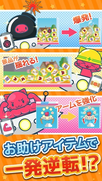 アームの強さを上げて景品をつかみやすくするアイテムや景品を大きく動かすことができる爆弾アイテムなど、