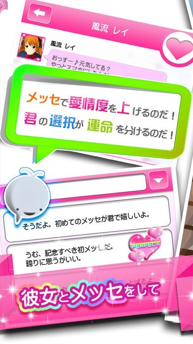 LINEのようなメッセージで美少女キャラクターたちと彼氏彼女のようなメッセージのやり取りを楽しめます。3択のメッセージからより良いメッセージを選んで愛情度を上げていきましょう。