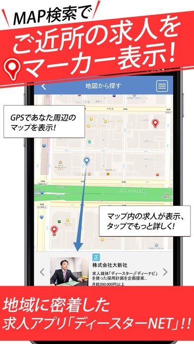 現在地(自宅など)近くの求人情報が一目でわかります。