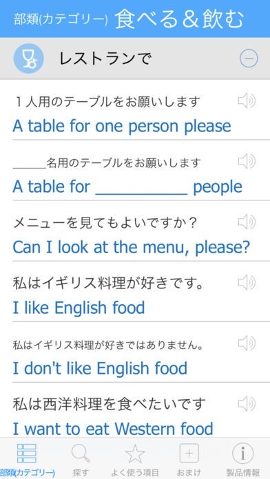 難しかったり覚えにくいフレーズがあったとしても、正しい発音を聞きながら覚えられるようになっています。カテゴリー別にまとめられているので、フレーズが探しやすいのも特徴です。