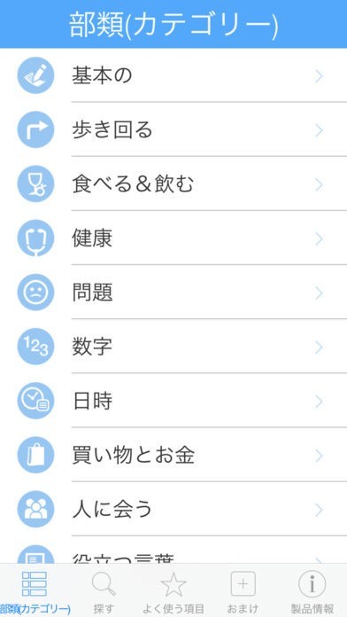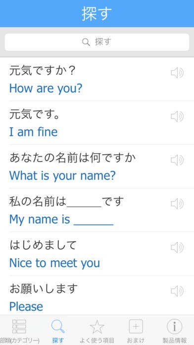 500以上のフレーズを10種類のカテゴリに分類して収録されているので、使用するシーンに応じたフレーズを素早く見つけ出すことができます。カテゴリ以外にもフレーズ検索機能も搭載されています。