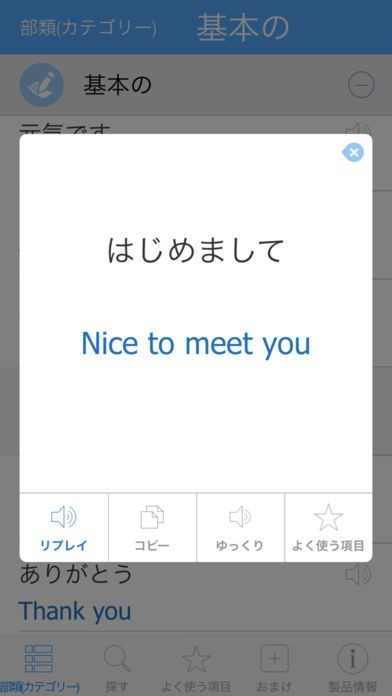 使いたいフレーズは、予めお気に入りに登録しておくことで、旅先などでもスムーズに取り出すことが出来ます。特に、トラブル時に使えそうなフレーズは、登録しておく事をおすすめします。