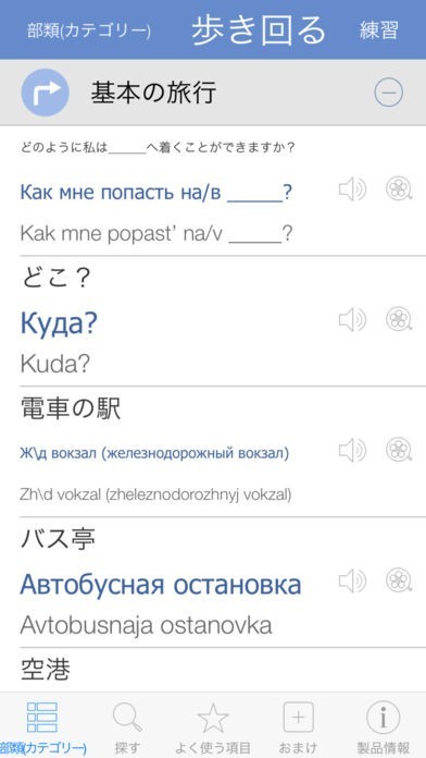 ロシア語の各フレーズには、分かりやすいようにキリル文字とローマ字の併記がされているので、特に、ロシア語学習を始めたばかりの人達には、大変使いやすくなっています。