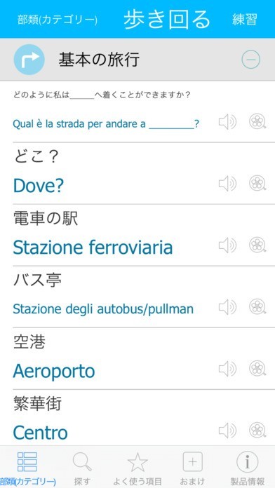 ‐ 旅行に必要な500以上のイタリア語の単語やフレーズ。イタリア文字での表示、日本語からイタリア語への翻訳、ビデオクリップつき。