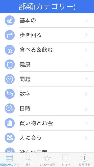 フレーズは500以上ありますが、飲食や買い物など10種類のカテゴリごとに分類して収録されているので、シチュエーションに応じて使えるフレーズをすぐに調べることができます。
