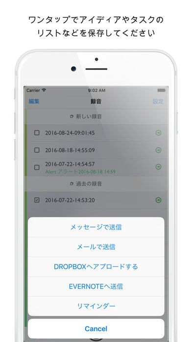 App Storeより引用お使いの携帯電話やAppleウォッチに素早く自分のアイディアやタスクのリストなどを保存してください。ただアイコンをタップし、短いメモを言うと、それはあなたのリマインダーになり、Dropbox、Evernote, または電子メールでそれを見つけることができます。すべてワンタップで!