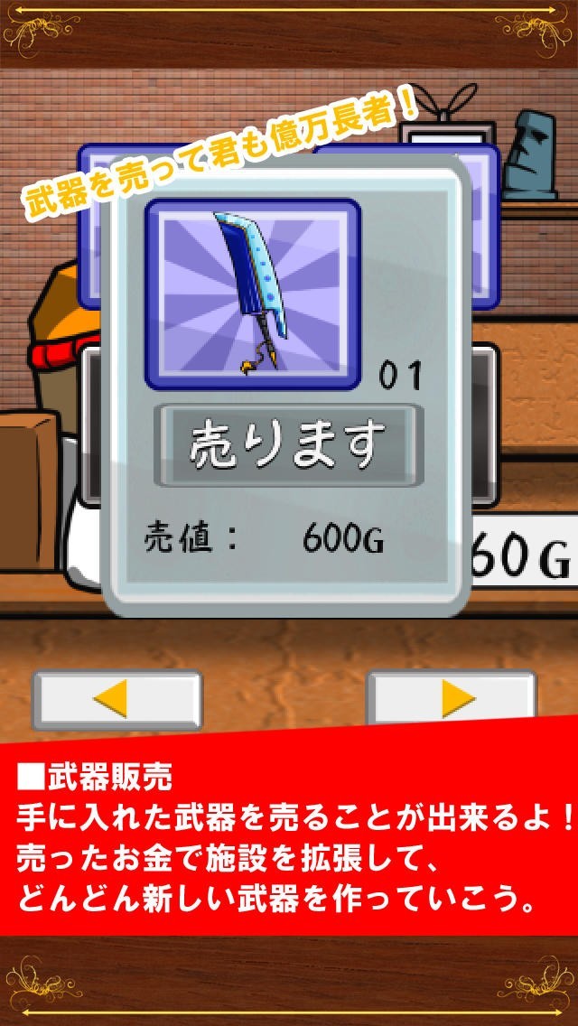 鍛冶職人となって素材から武器を作っていくゲームです。素材を探して採取し、様々な種類の素材と数量を組み合わせて武器を作ります。組み合わせ方は無数にあるので多彩な武器を生み出せます。作った武器と素材を組み合わせて新たな武器を作ることも可能です。武器は売ることができ、売上金で施設をレベルアップしていきます。採取場・武器の値段・素材出現率・レシピ解放の4項目を選ぶことができます。 作った武器は図鑑でコレクションでき、名前や売価を確認することができます。