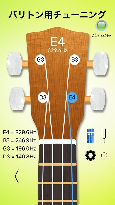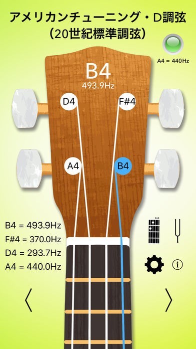 アプリの画面には実際のウクレレのヘッドの部分と同じような図が表示されています。弦の張力を少しずつ変えながら音を鳴らすことによって正しく音程に合った場合は色が変わるので一目でわかります。