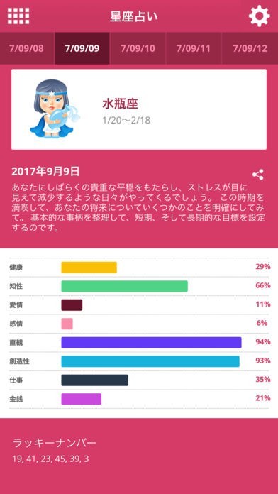 お金・健康・恋愛・仕事をはじめ8種類の占い結果の良し悪しをパーセンテージとグラフで表示してくれるので、その日の運勢がグラフを見るだけですぐに分かります。長々と文章を読むのが苦手な人にはオススメです。