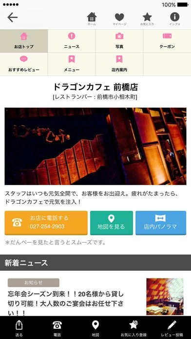 また、お店からの「ニュース」が頻繁に更新されるので、最新のお店情報やイベント情報をチェックできます。