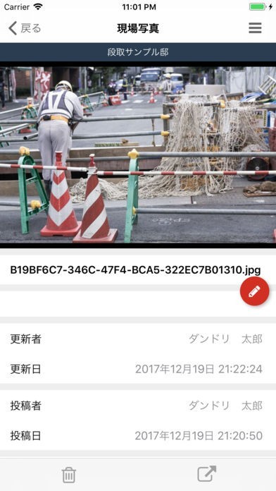 作業の状況や現場の写真は誰が投降したのか、そしていつ投稿されたのかが表示されるシステムになっています。現場のスタッフがより責任をもって働くことができる機能です。