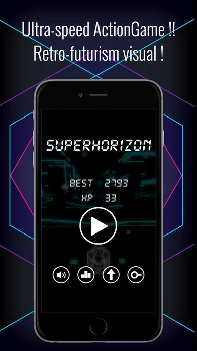 「SUPERHORIZON」は、真っ暗の中光るネオンを手掛かりに地平線まで目指して駆け抜けるゲームアプリになっております。ブルーやピンクのネオンが光っており、未来的なグラフィックになっています。障害物が道中置かれているので、左右に避けながら進んでいきます。距離が長くなるとともにスピードもあがり、ジャンプしなければ通れないスポットも出現してきます。視界も悪くなってくるので、次々に出てくる障害物を避ける瞬時の判断が必要になってきます。
