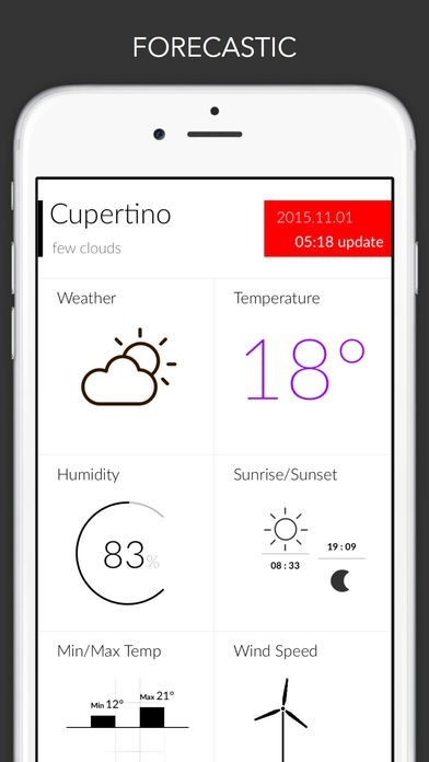 App Storeより引用Forecastic is a free iOS app that gives you vital weather related information. Swipe down for a full 2-week weather forecast. View humidity, temperature, sunrise, sunset, minimum temperature, maximum temperature, and wind speed.