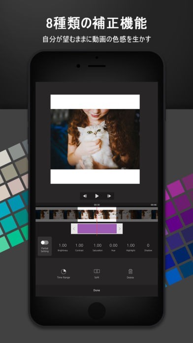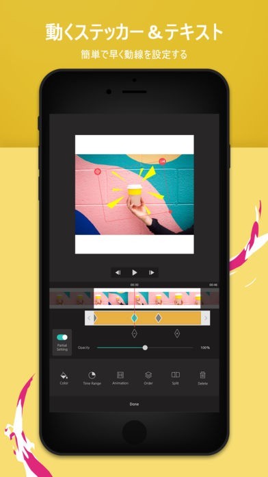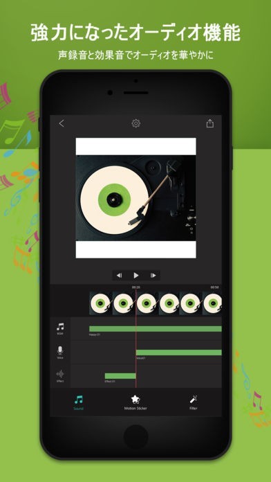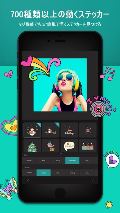自分の撮った動画にさらに可愛く面白い効果をつけて、自分だけの素敵な動画に仕上げるのを手伝ってくれるアプリです。50~100フレーム内臓の可愛くスタイリシュなスタンプは変色も可能、タイムラインに合わせてまるでGIF動画のように動きます。このモーションスタンプ機能は、回転や拡大、縮小操作はもちろん、希望した位置に移動させることも出来ます。拡大しても鮮明な表示がされることも人気の秘密です。字幕やスタンプの登場やフェイドアウトの時間も調節できて便利です。