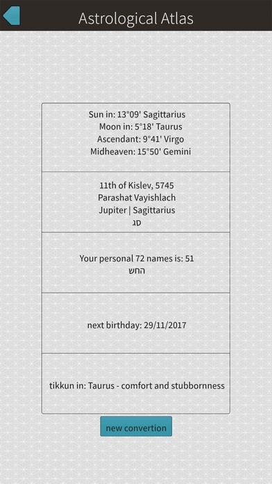 - Astrological Chart (you kabbalistic sign, tikkun and personal 72 names)