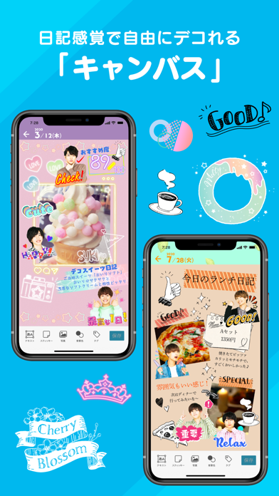 おしゃれな日記や、旅行や育児の記録など、自由自在に可愛くデコれるフリースペース。スティッキーはもちろん、写真を貼ったり、文字に色をつけたり、もっと楽しい思い出にしよう!