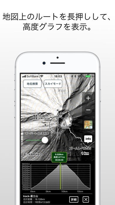 登山やハイキングで高度グラフを使いましょう。山の断面図が表示され、今いる場所がすぐに分かります。現在地の標高と登山ルートやハイキングコース内の位置を確認することができます。
