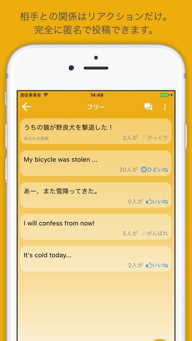 愚痴も本音も言い放題!リアクションを指定して今の気持ちを投稿しよう!