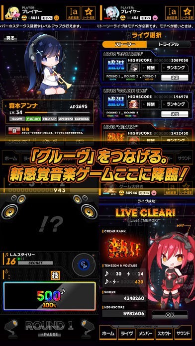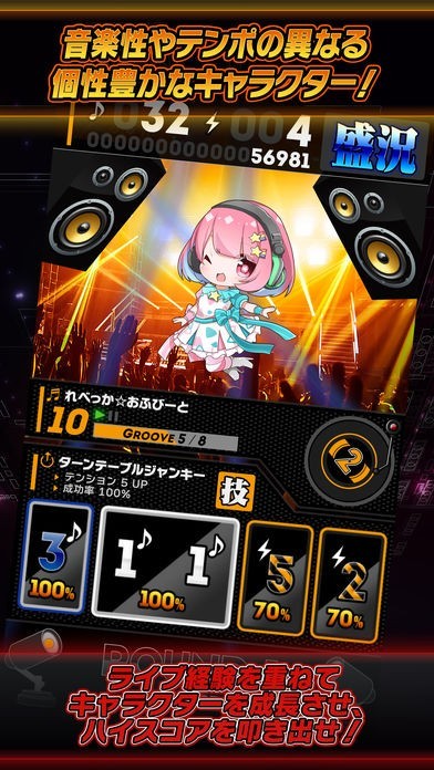 ジャンルやテンポの異なる個性豊かなキャラクターをライヴに出演させ、4小節の『グルーヴ』をカード操作でつないでフロアを沸かせ!