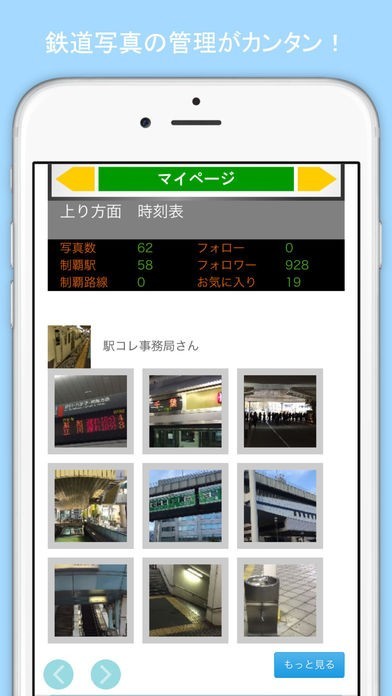 自分の写真はここで確認できます。撮った枚数や制覇した駅や路線の数もここでチェック!自分のフォローやフォロワーさんのマイページに行くこともできます。タイムラインで集めた「お気に入り」の写真一覧もマイページで見られます。