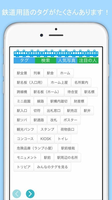 「駅」と一言で言っても、その要素はたくさんあります。「ホーム」や「線路」「駅名板」などはもちろんのこと、「財産標」や「跨線橋」「荷物扱口」などこだわりのキーワードまでたくさん揃っています。欲しいタグがありませんか?でも大丈夫。駅コレでは自由に新しいタグを追加することもできます。あなたが作ったタグで他の人たちが盛り上がるかも・・・?!
