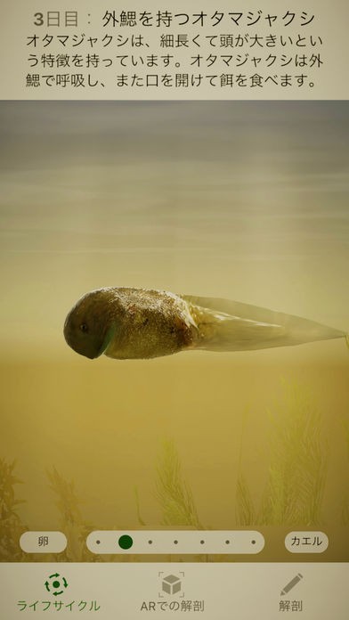 カエルがおたまじゃくしとして生まれてから成体になるまでの様子を、スムーズに動くCGアニメーションで詳細に観察することができます。生態や習性を詳しく解説したテキストも付属しています。