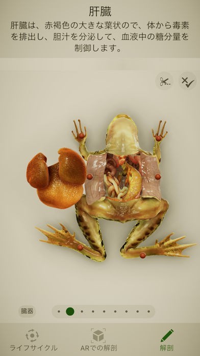 リアルなグラフィックを用いたバーチャルに解剖を体験できる機能によって、各器官の役割や働き、特徴などを学びながら、本物を傷つけることなく体内の詳しい仕組みを知ることができます。