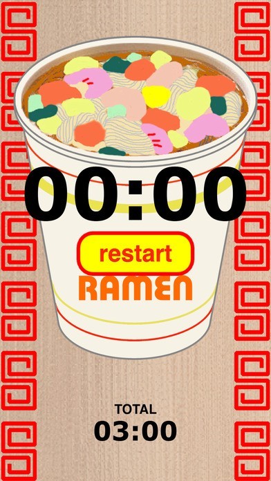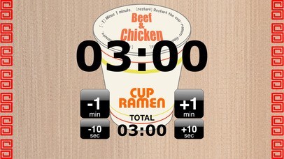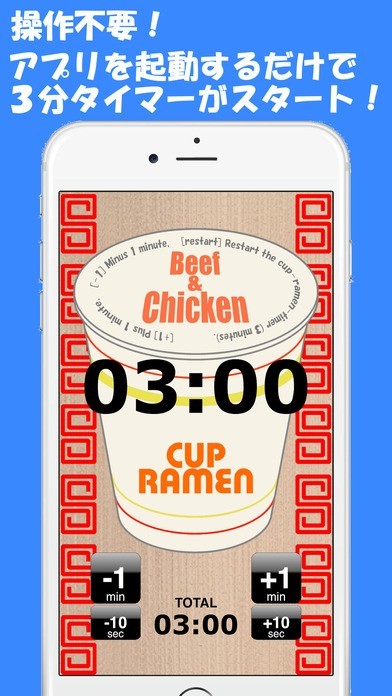 App Storeより引用操作不要!押せば始まる3分計 カップラーメンタイマー。