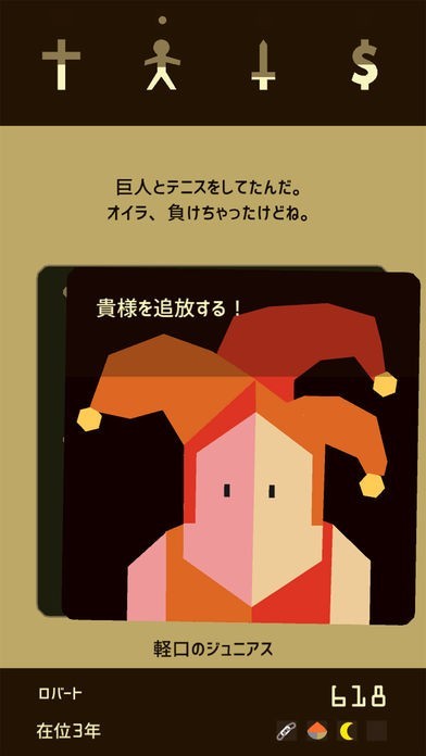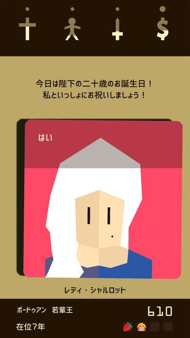 2択機能があります。謁見希望者の進言や相談に2択で答えていきます。国を存亡を考えながら繰り返し行われ、統治者として王の器を試していきます。自分自身の中で統治する力量があるのかどうか、ゲームを通して知ることができます。