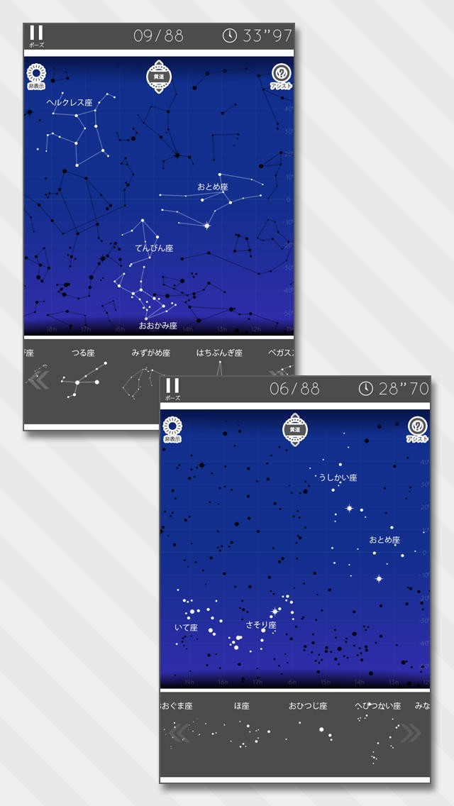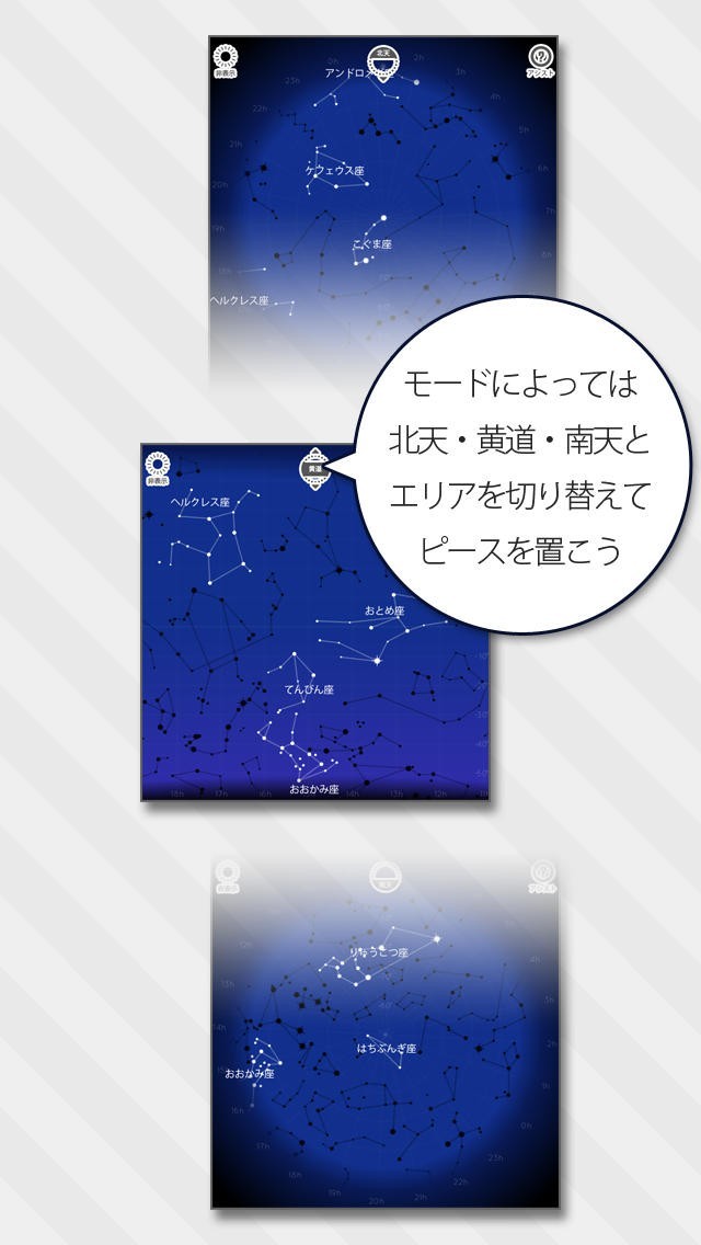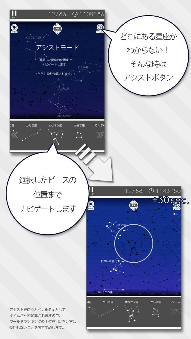 星座初心者で、星座が全くわからない初心者の方は、アシスト機能を使えば簡単です。画面上のアシストボタンを押すと、選択したピースの位置までアシストしてくれます。ゲームをやり込むほど、星座に詳しくなっていきます。