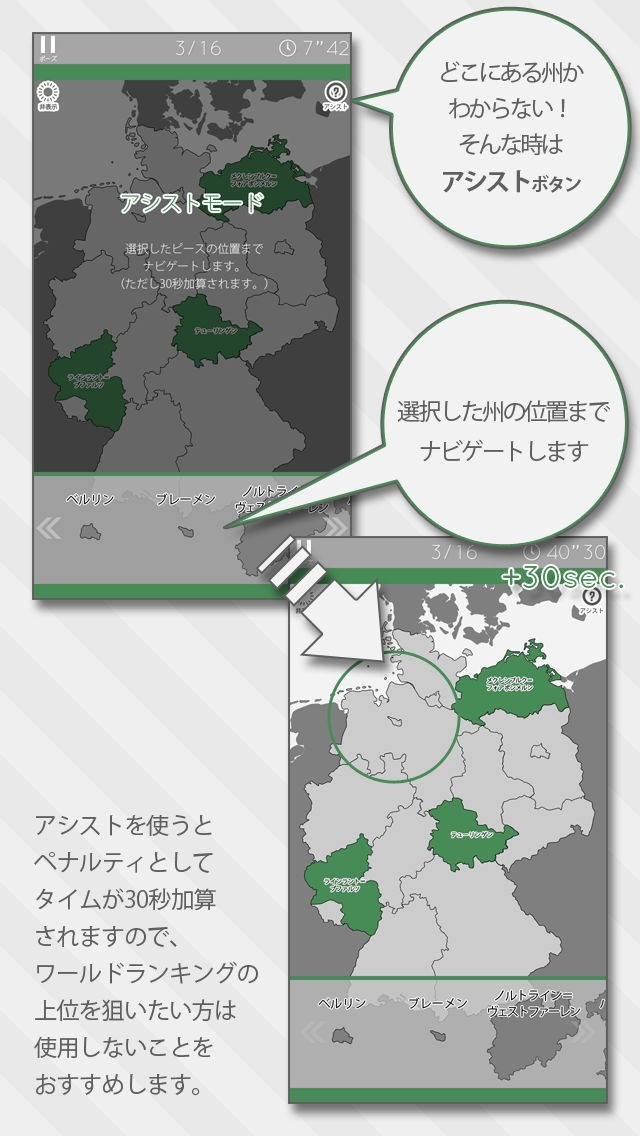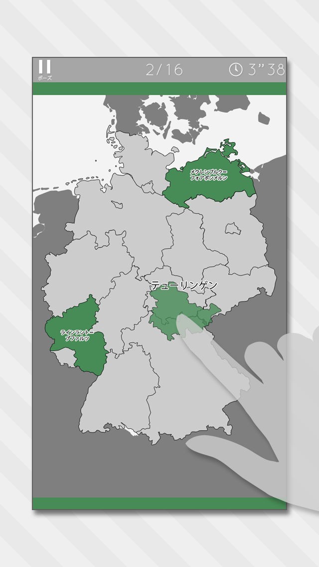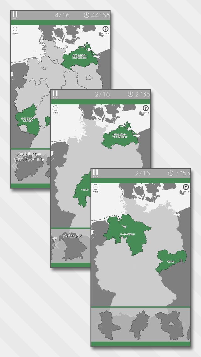 App Storeより引用ジグソーパズル感覚でドイツの州を覚えることができる教育系ゲームです。楽しくテンポよく遊べることを重視しました。