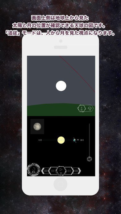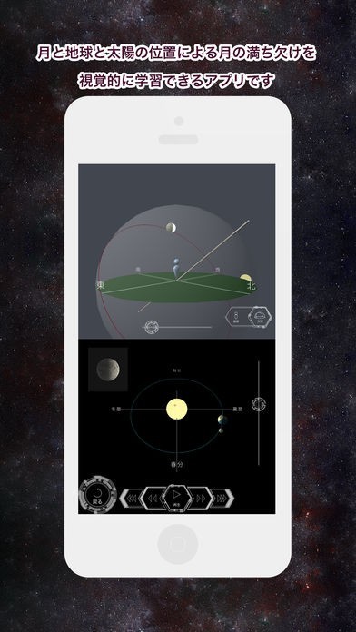 App Storeより引用月と地球と太陽の位置による月の満ち欠けを視覚的に学習できるアプリです。