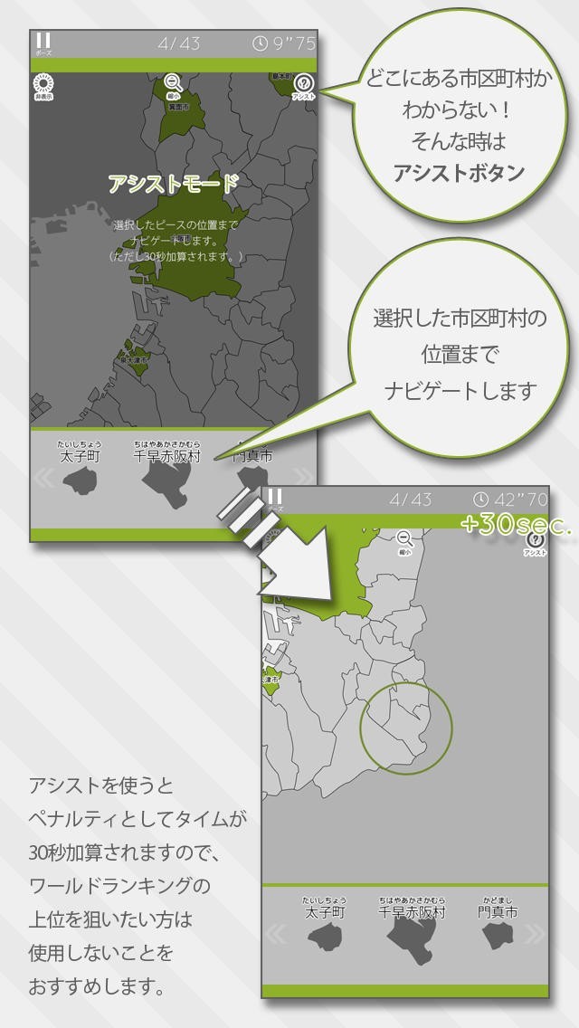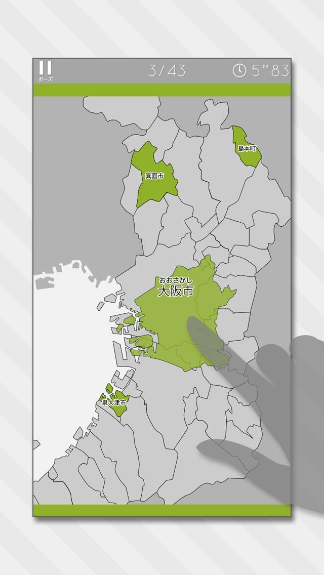 名前の通り地図パズルゲームをしながら自然と大阪の市町村の位置が覚えられる