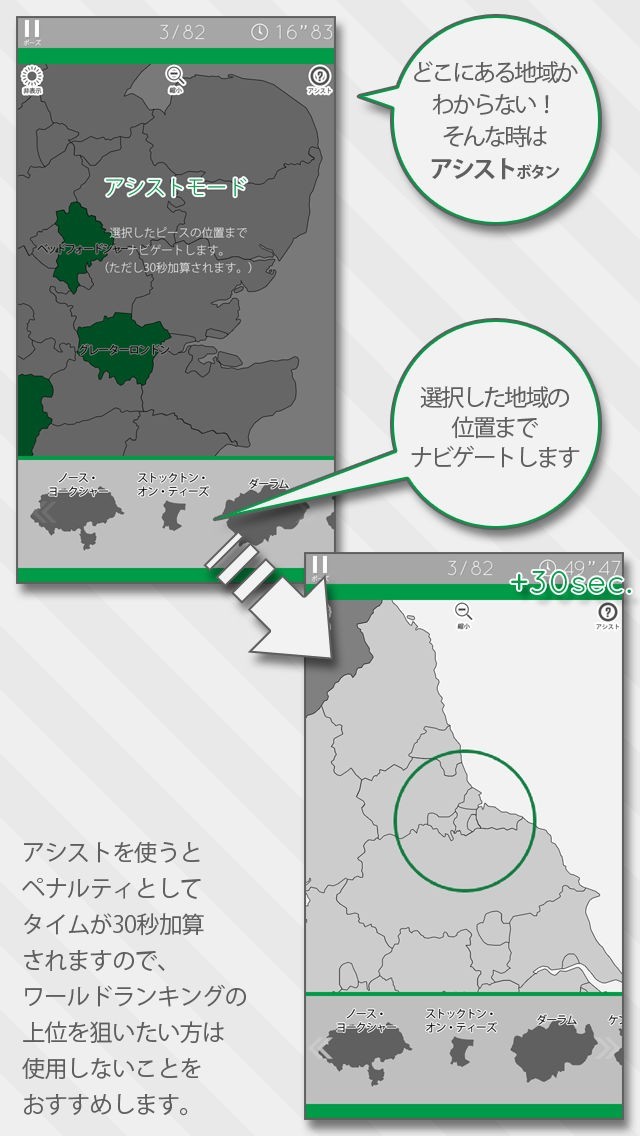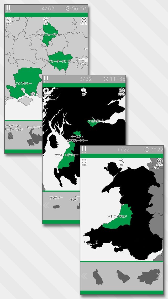 地域名や境界線の表示有無が異なる3つのゲームモードを用意しています。また、エリアは「イングランド」「スコットランド」「ウェールズ」「北アイルランド」の4つに分かれています。