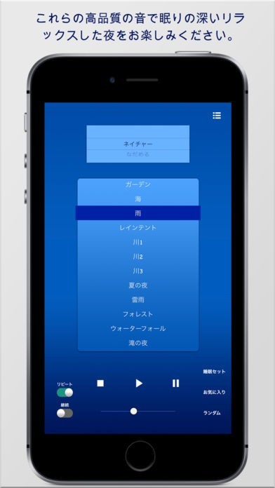 心地よいメロディー、自然の響き、ホワイトノイズ、落ち着いた雰囲気などを聴くことができます。あなたがリラックスして最高の夜間睡眠を可能にする最も現実的で自然な音環境を提供するように設計されています。あなたの体を深く、睡眠を回復させる穏やかな夜にお召し上がりください。あなたの目覚まし時計をオフにし、これらの高品質の音で昼寝を取る。