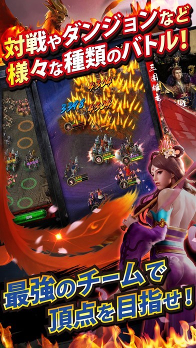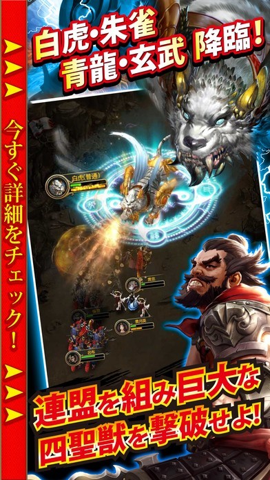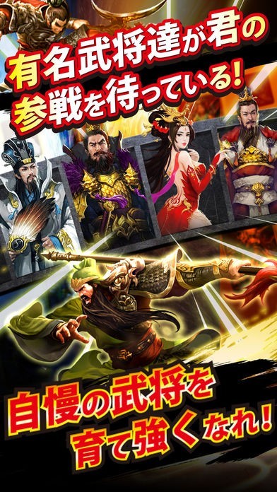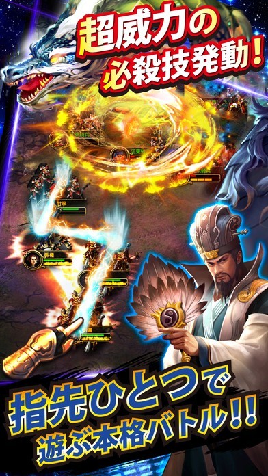 三国志の有名武将達が入り乱れるメインストーリーは勿論のこと、ワンタップで何千もの軍勢の指揮をするバトルでは最高のタイミングでスキルを発動して勝利を次々と手にしましょう。 お気に入りの武将を様々な方法で強化すれば、レア武将を確実にGETできます。自分の軍勢を更に強くして、ランキング形式の常設競技場で順位をどんどん上げていき、頂点を目指しませんか? また、他プレイヤーと共闘して巨大な四聖獣を撃破すれば、仲間との絆が深まること間違いなし!? オンラインで他プレイヤーと繋がるもよし、一匹狼で頂点を目指すもよし、”あなた”が築きあげる”あなた”だけの三国RPG!